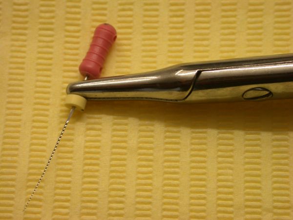 Met behulp van de behandelmicroscoop is de bodem van de pulpakamer perfect te “lezen”. De punt van een vijl is rechtstreeks in een kanaalingang te steken. Het is handig om de vijl in de naaldvoerder te plaatsen. Er is dan meer zicht op de bodem van de pulpakamer.