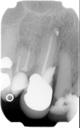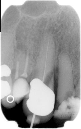 Als een perforatie in een krom kanaal een aantal millimeters vanaf de apex heeft plaats gevonden, is het verstandig om het apicale kanaalgedeelte en de perforatie beide af te sluiten met MTA (Pro Root).