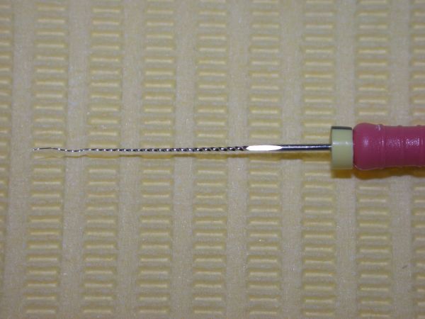 Zeker roterende NiTi vijlen kunnen breken. Ga nooit met een roterende vijl in een kanaal waar nog geen handvijl nr 15 tot de apex is geweest.